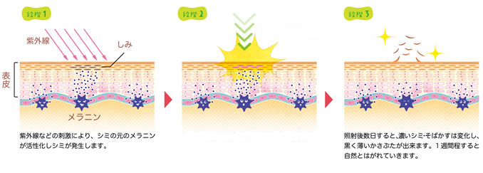 • シミに良く反応したところは黒く浮き上がり、3~4日で薄いかさぶた(マイクロクラスト)となり、7~10日頃からポロポロとはがれてきます。